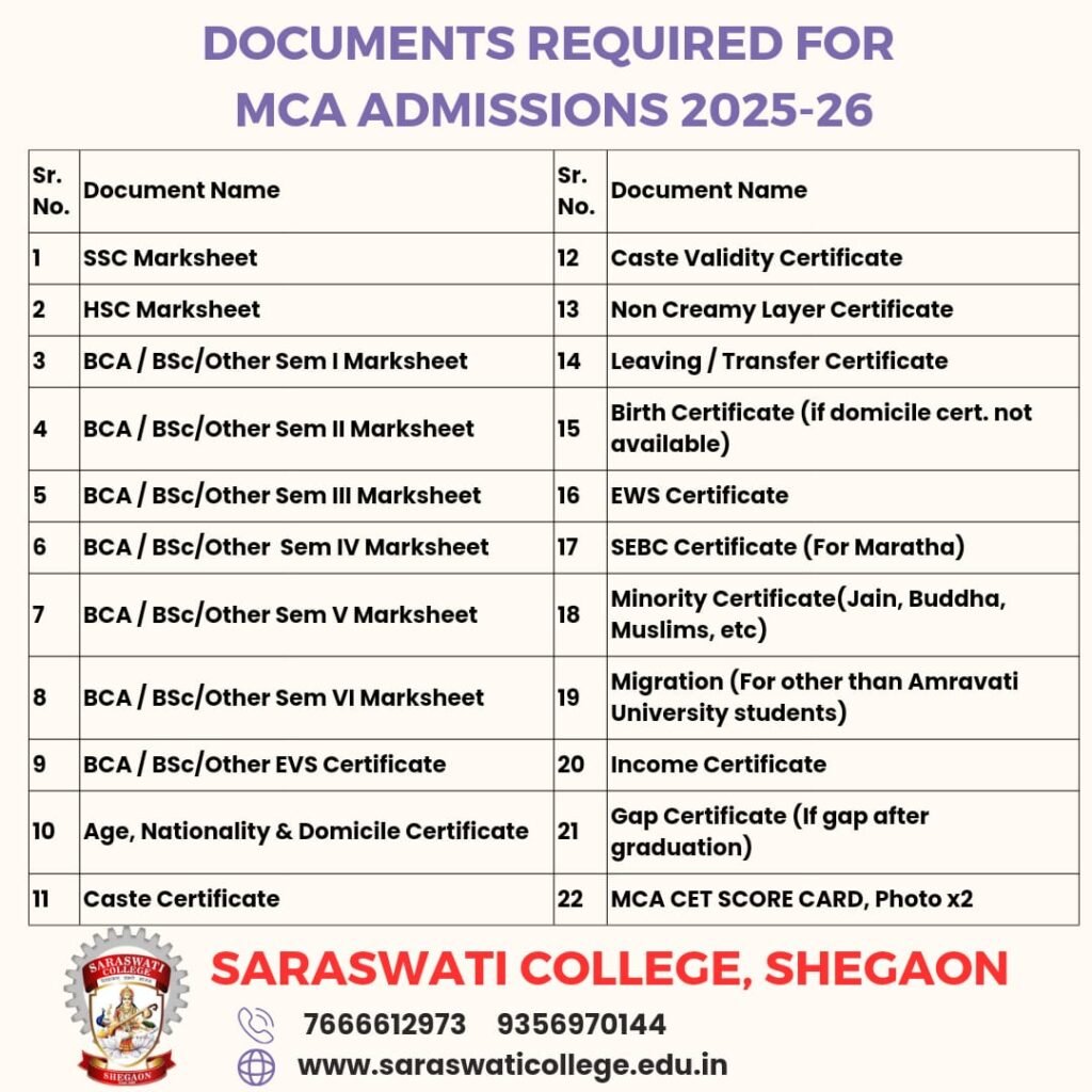 1. To honour the merit of the applicants, Saraswati College offers scholarships to the applicants enrolled on the programmes. The Institute Scholarship Programme offers special scholarships to assist MCA aspirants in realizing their dreams of becoming successful. Every year, Saraswati College provides limited scholarships to meritorious students as per institutional policy.